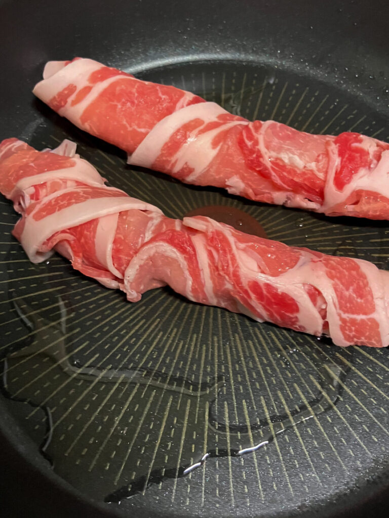 2.豚バラ肉に黒コショウをかけ長ネギを覆うようにくるくるとしっかり巻く