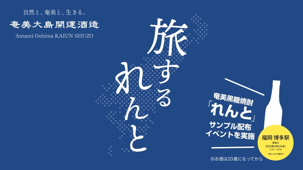 2025年4月24日(木)福岡市の博多駅筑紫口にて、代表銘柄である奄美黒糖焼酎『れんと』の特別イベント、「旅するれんと in 博多」奄美黒糖焼酎『れんと』街頭サンプリングを実施いたします。