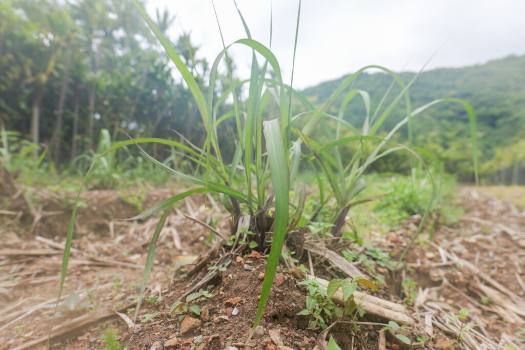 弊社工場の近くにあるサトウキビ畑には、青々とした芽が畑に顔をのぞかせ始めました。