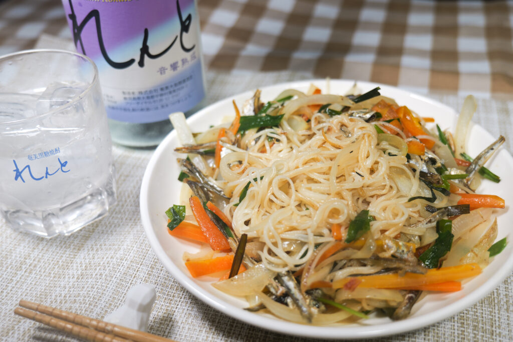 4.熱したフライパンにたっぷりのサラダ油を引き、いりこ、にんじん、玉ねぎ、ニラの順で炒め、ほんだしを入れる。