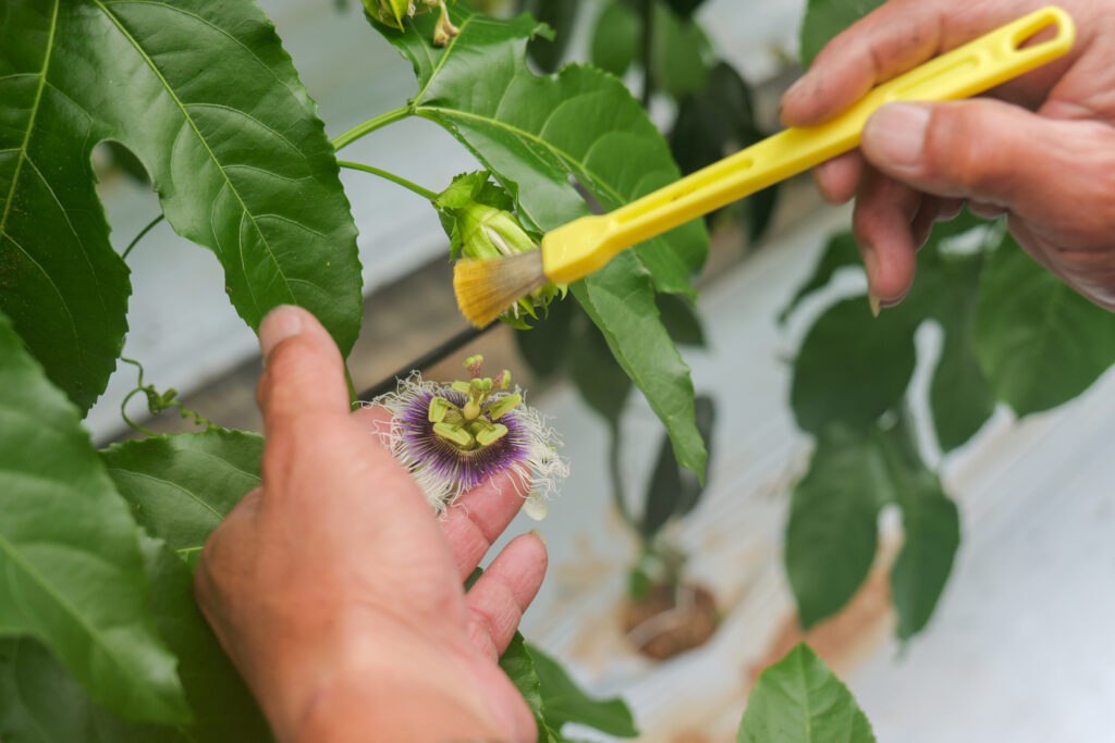 繊細なパッションフルーツの花は、手作業による丁寧な受粉が実を結ぶための大切なステップ。専用の刷毛を使って雄しべの花粉を雌しべに優しく移していきます🖌️🌺