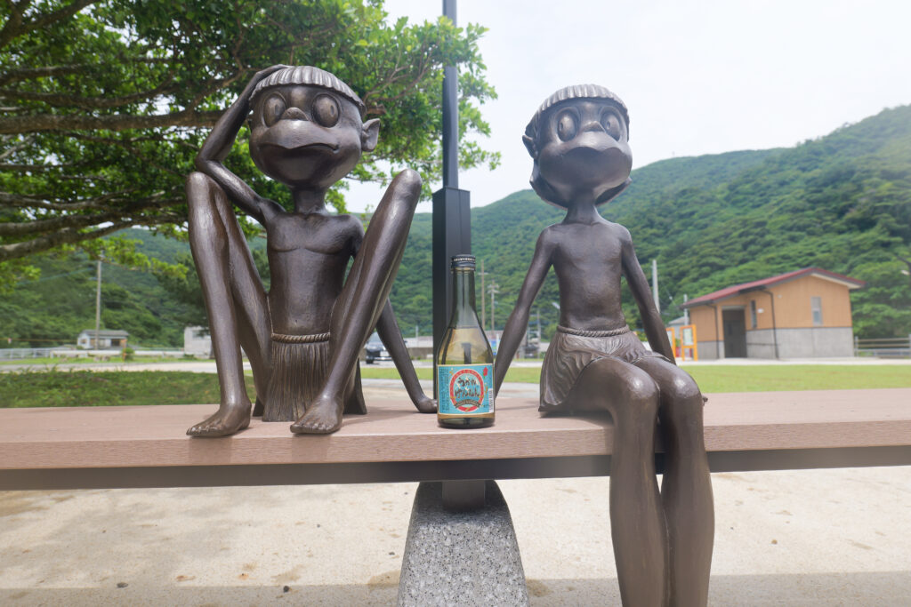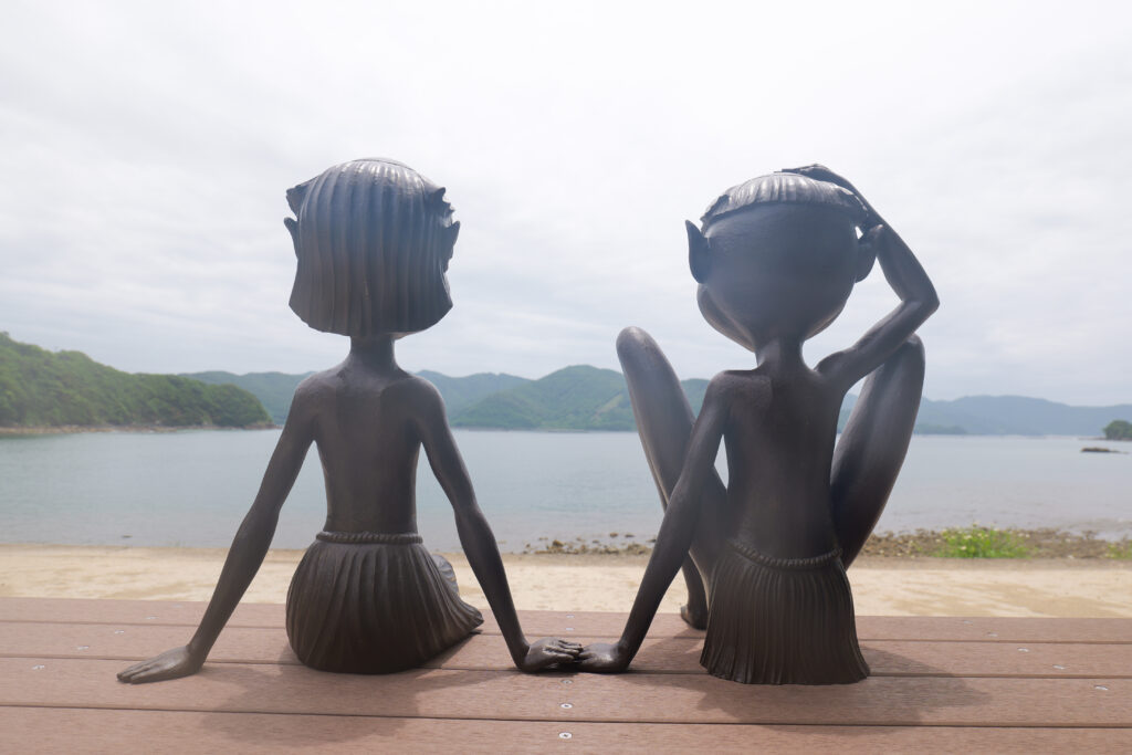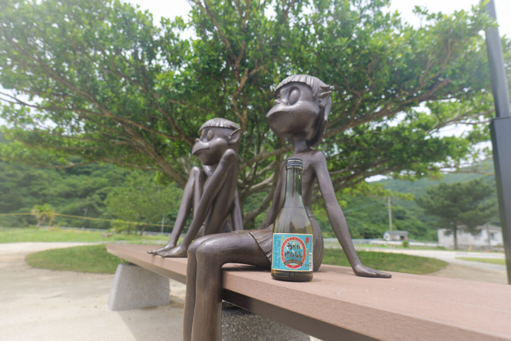 👣海沿いのベンチには、ケンムンをモチーフにした可愛い像が設置されていて、癒しのフォトスポットに📸✨手をつなぎながら海を見つめる後ろ姿には、思わずほっこり…