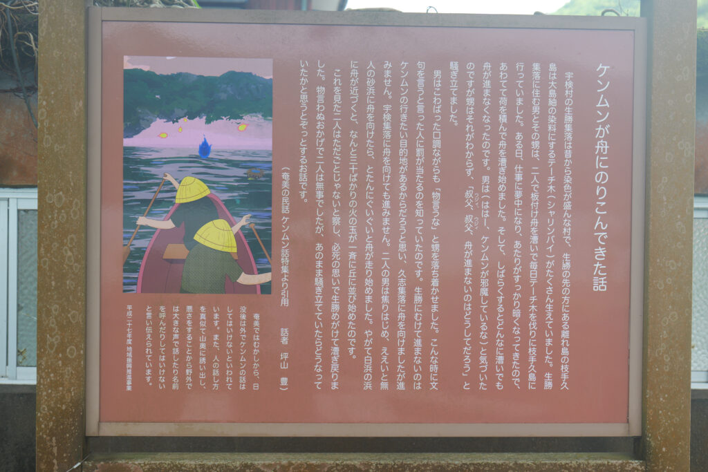 生勝集落に住む男とその甥は、二人で板付け舟を漕いで毎日テーチ木を伐りに枝手久島に行っていました。ある日、仕事に夢中になり、あたりがすっかり暗くなってきたので、あわてて荷を積んで舟を漕ぎ始めました。そして、しばらくするとどんなに漕いでも舟が進まなくなったのです。男は(ははー、ケンムンが邪魔しているな)と気づいたのですが甥はそれがわからず、「叔父、叔父、舟が進まないのはどうしてだろう」と騒ぎ立てました。
