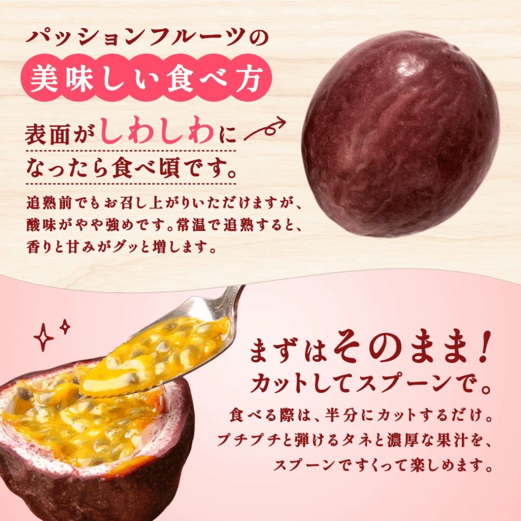 パッションフルーツを半分にカットして種のまわりのゼリー状の果肉をスプーンですくってお召し上がりください。