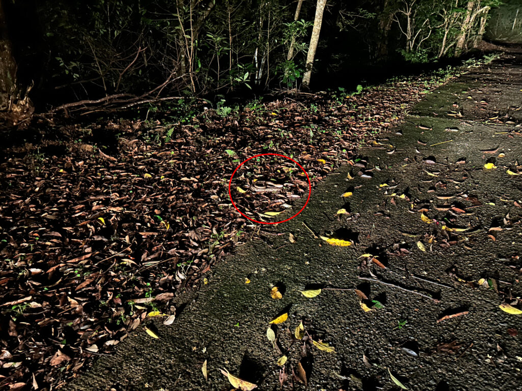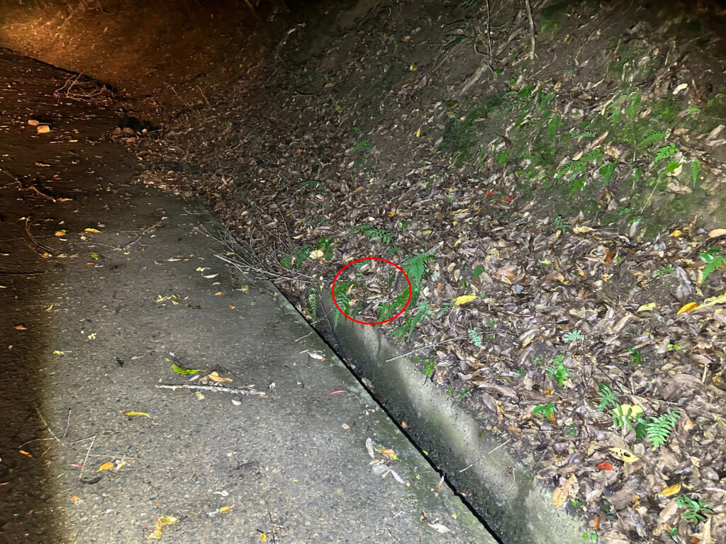 ハブは夜行性で、夜の林道や山道、落ち葉が積もった場所、石垣や用水路の縁などに潜んでいます。昼間は涼しい茂みの中や石のすき間などで身をひそめて休んでいることが多いです。