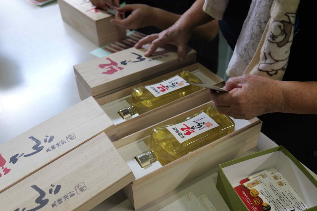 特別な贈り物『紅の宴』を、桐箱に詰める作業の様子です。