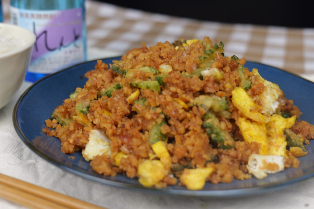 3.ゴーヤを約2分炒めてほぐし、茶うけ味噌とざらめ糖を加えて弱火で炒め合わせる
